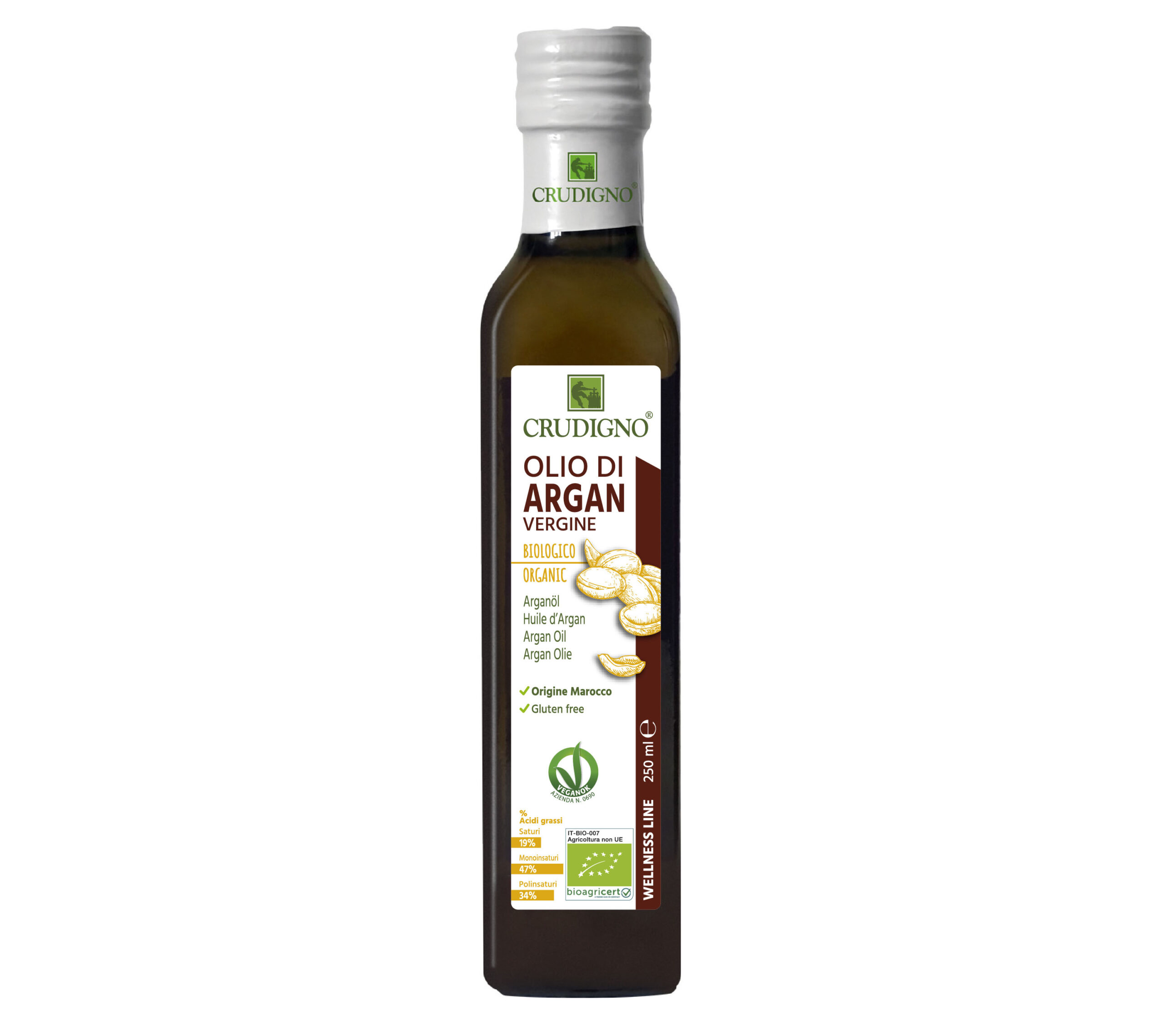 Oil obtained from the first pressing of argan seeds from controlled organic farming in accordance with EC Reg. 834/2007.